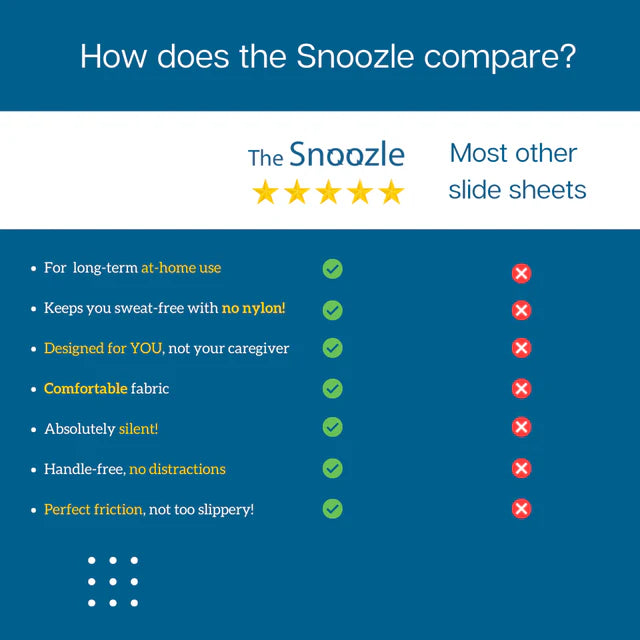 Not really! While hospital slide sheets are designed primarily for caregivers to move patients, the Snoozle is created specifically for you. It's perfect for independent, long-term at-home use. Unlike hospital sheets, it doesn't use slippery nylon, which can feel uncomfortable or trap heat. Instead, the Snoozle offers breathable, comfortable fabric with just the right amount of friction—no excessive slipperiness!